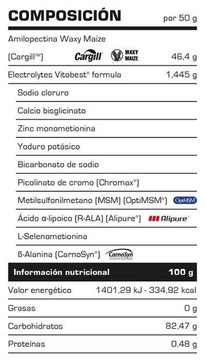 Amylopectin + Electrolytes tiene amilopectina 100% de maíz que tiene un peso molecular de entre 10 millones y 1000 millones que es el mayor obtenido por un carbohidrato. El origen de la materia prima es Cargill la mejor del mercado. Tiene una osmolaridad muy baja y por tanto es capaz de minimizar el riesgo de problemas estomacales. Es la forma más efectiva y rápida de reestablecer los depósitos de glucógeno muscular y hepático. De esta manera conseguimos, el suplemento ideal para todo tipo de atletas.
