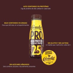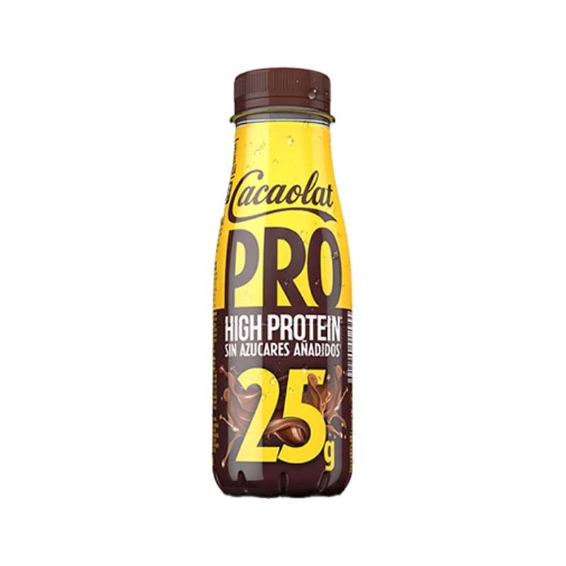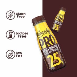 CACAOLAT PRO High Protein une lo mejor del auténtico cacao con la proteína que tu cuerpo necesita para rendir al máximo. Cada botella te ofrece 25g de proteína de alta calidad, pensada para recuperar, fortalecer y mantener tu masa muscular, con una textura cremosa y el sabor irresistible de siempre. Y lo mejor: es bajo en grasas, sin azúcares añadidos, sin lactosa y sin gluten. Una elección inteligente para quienes quieren disfrutar cuidándose, sin complicaciones.
