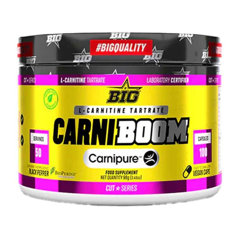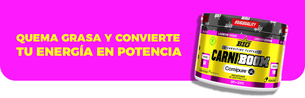 Carniboom de Big® es un suplemento avanzado a base de L-Carnitina y extractos vegetales, diseñado para transformar la grasa en energía y mejorar tu rendimiento durante el entrenamiento. Con Carnipure®, la carnitina de mayor calidad y pureza, garantizamos un producto libre de impurezas y apto para veganos y vegetarianos.
