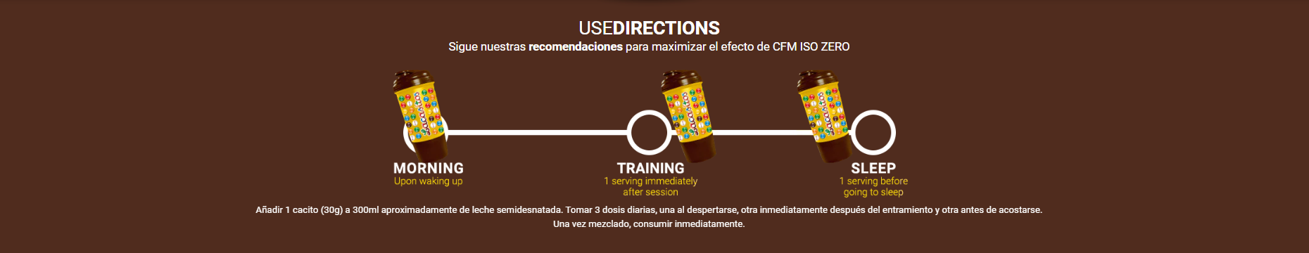 Mezcla 30 g (una medida del cazo incluido) con 300 ml de leche desnatada. Puedes tomar entre 1 y 3 dosis al día, según tus necesidades, ya sea al despertar, después de entrenar o antes de dormir. Es importante consumir la mezcla inmediatamente después de prepararla.