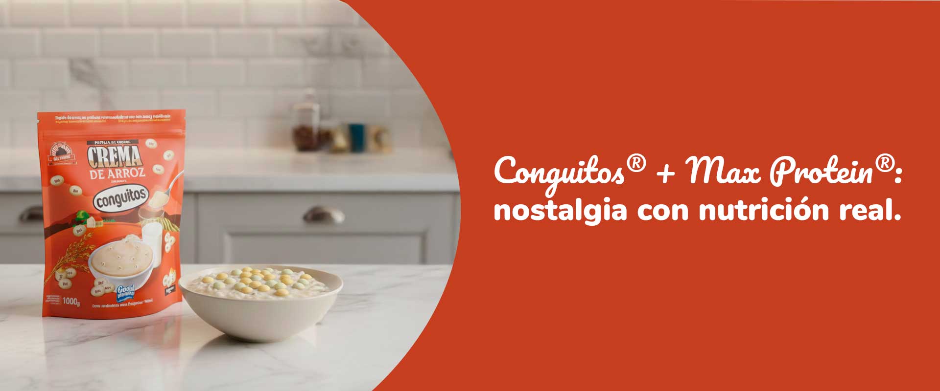 La crema de arroz premium de Max Protein® con auténticos mini Conguitos®, textura ultra cremosa y digestión ligera. Energía rápida, sabor irresistible y preparación en segundos.