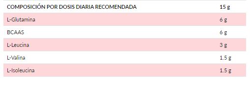 Ingredientes: L-Glutamina, Aminoácidos de cadena ramificada (BCAA´s 2:1:1): L-Leucina, L-Valina, L-Isoleucina, Maltodextrina, Aromas, Acidulante: ácido cítrico, Edulcorante: E955, Colorante: E110*.