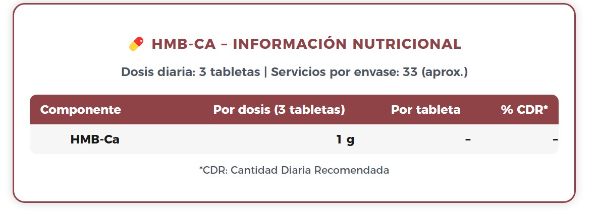 Hidroximetilbutirato Cálcico (HMB-Ca), agente de carga (celulosa microcristalina), antiaglomerante (estearato de magnesio).