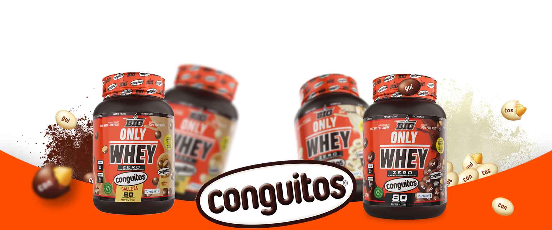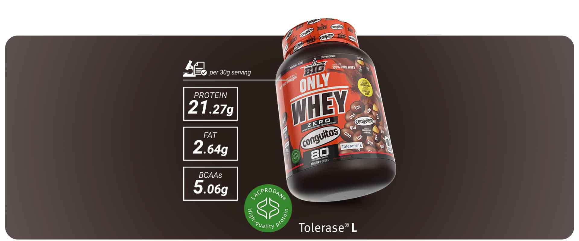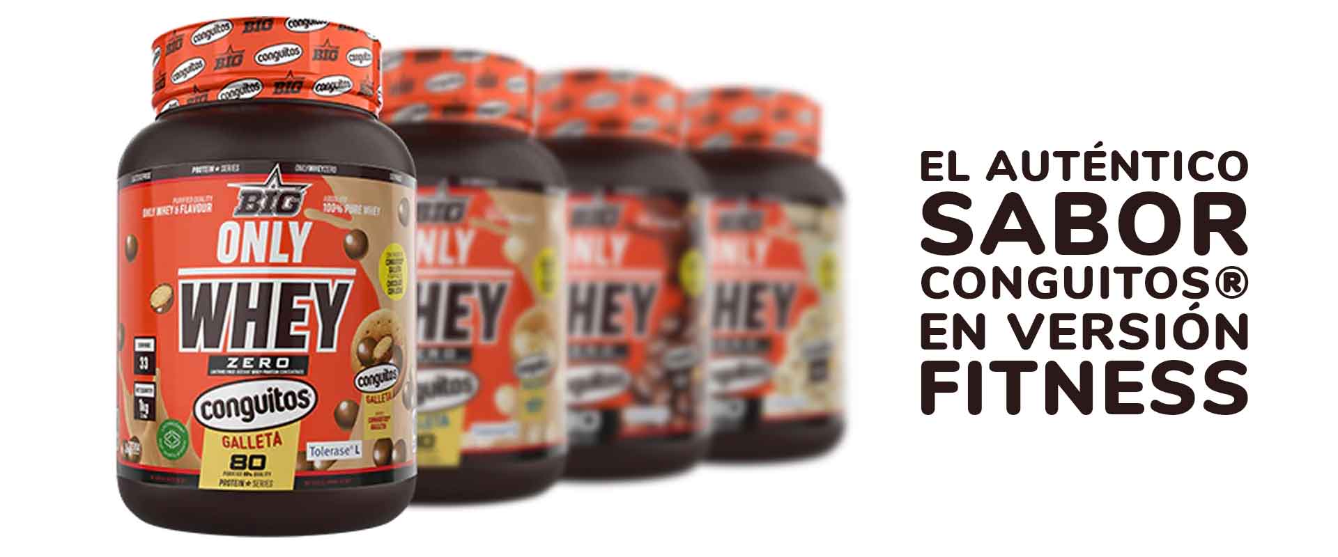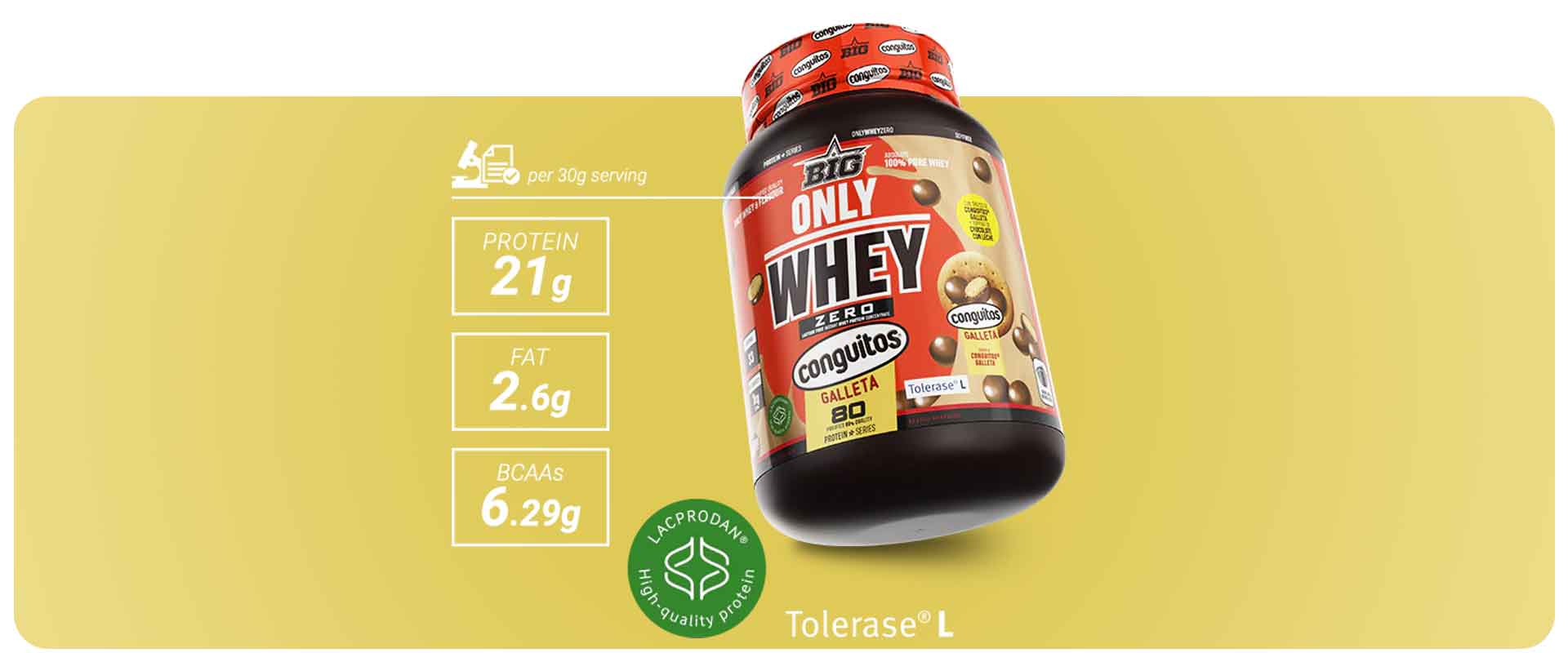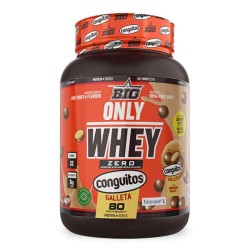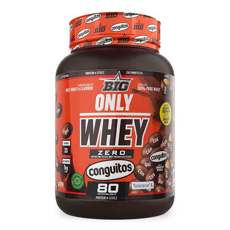 La nueva ONLY WHEY ZERO sabor CONGUITOS® de BIG® es una proteína de concentrado de suero sin lactosa, elaborada con Lacprodan® SP-8011V Instant, una de las materias primas más puras y eficaces del mercado, y enriquecida con la patente Tolerase® L-Lactasa, que mejora la digestión de la lactosa presente en el suero.