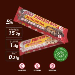 Con bajo contenido en azúcar (solo 1.4 g por barrita), sin gluten y sin aceite de palma, las PROTEIN BAR MINIDONA son el snack perfecto para cuidar tu cuerpo sin renunciar al placer.