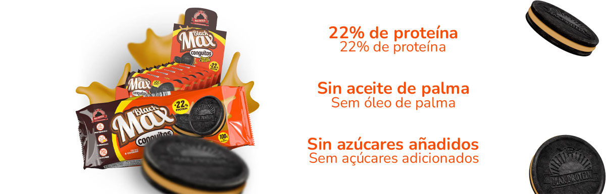 Descubra os novos Blackmax Conguitos® Peanut Cream da Max Protein®, uns biscoitos proteicos únicos com autêntico creme de amendoim Conguitos®. Cada biscoito combina o sabor tradicional do Blackmax com um delicioso recheio cremoso, sem óleo de palma e sem açúcares adicionados.